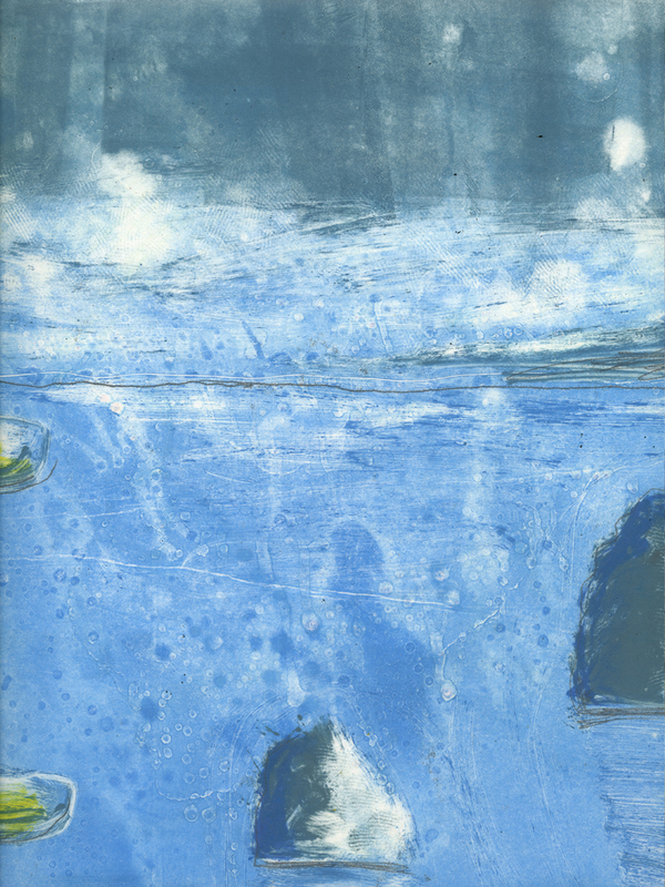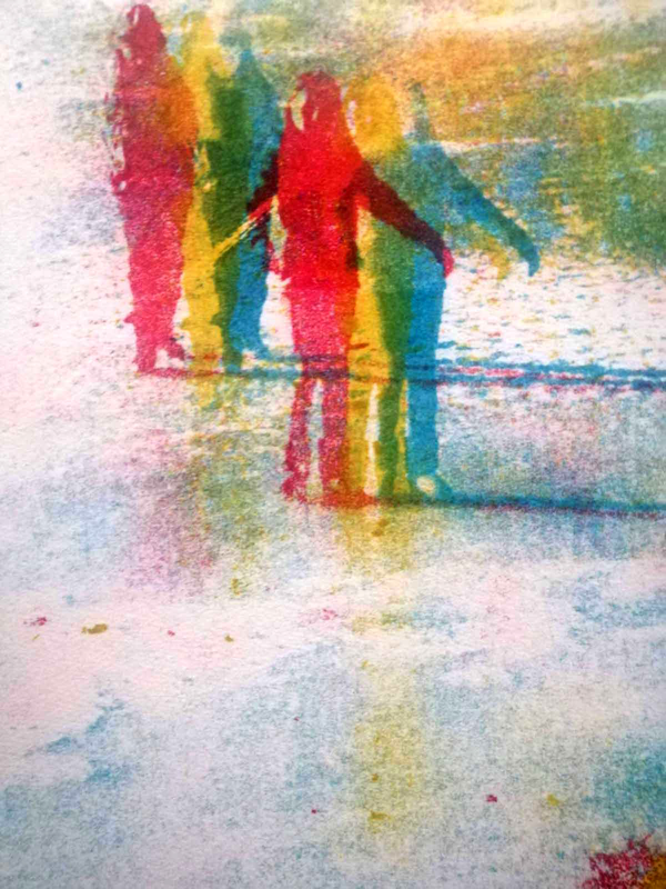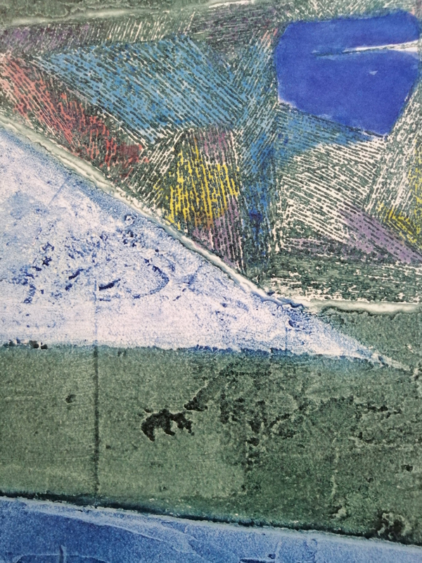 L’effetto è simile all’acquarello. Si possono ottenere campiture molto delicate, evanescenti o di toni leggerissimi, oppure per insistenza di pennellate sulle stesse aree arrivare a definire e saturare la zona interessata. L’artista ha lavorato distribuendo e dividendo su tre matrici differenti colori caldi e colori freddi. Ha inoltre sfruttato la caratteristica di fusione degli inchiostri calcografici durante la fase di stampa, con la sovrapposizione a registro delle matrici.