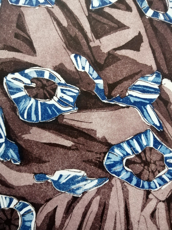 Applicare il metodo tradizionale dell’acquatinta significa dover circoscrivere e isolare con una vernice di protezione l’area che si desidera incidere, è quello che l’artista ha fatto in questo caso prima di polverizzare e fissare il bitume giudaico per poi immergere la matrice in acido. Il colore è stato concepito su due livelli, dunque su due matrici: una per i bruni e l’altra per i blu. Le diverse tonalità di colore sono ottenute grazie all’incisione con più tempi di acidatura e differenti polverizzazioni di bitume.