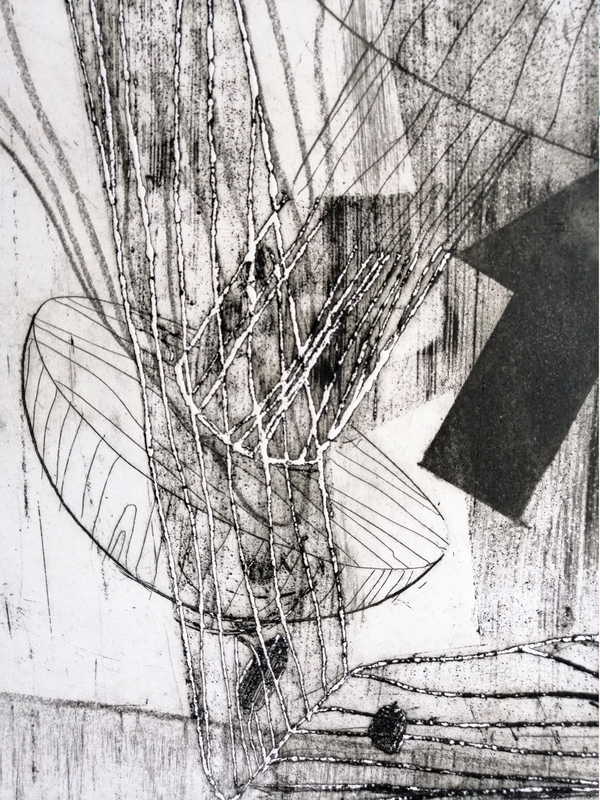 Si posso mescolare tecniche dirette e indirette procedendo per gradi di lavorazione per ottenere diverse variazioni di segno. In questo caso l’artista ha steso su tutta la matrice una vernice morbida e sensibile, e sovrapposto una carta molto leggera su cui tracciare il proprio disegno. La pressione esercitata dal gesto ha sottratto la vernice, scoprendo i segni; se in questa fase è l’acido a incidere il segno, il secondo e successivo intervento è stato fatto, invece, direttamente con una punta.