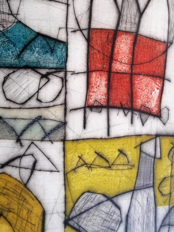 Utilizzare più strumenti per l’incisione diretta è come avere a disposizione un vocabolario e, come accade con le parole e il suono, le possibilità di variazioni del segno sono infinite. La matrice in rame, a differenza di altri metalli, permette di ritornare su alcune decisioni, di cancellare in parte o ritornare allo stato iniziale, per poter nuovamente incidere o per creare effetti visivi particolari. L’inserimento in Chine-collé in carta giapponese colorata sottolinea quanto sia interpretativa e importante la fase di stampa.