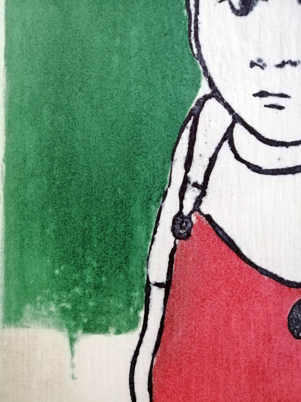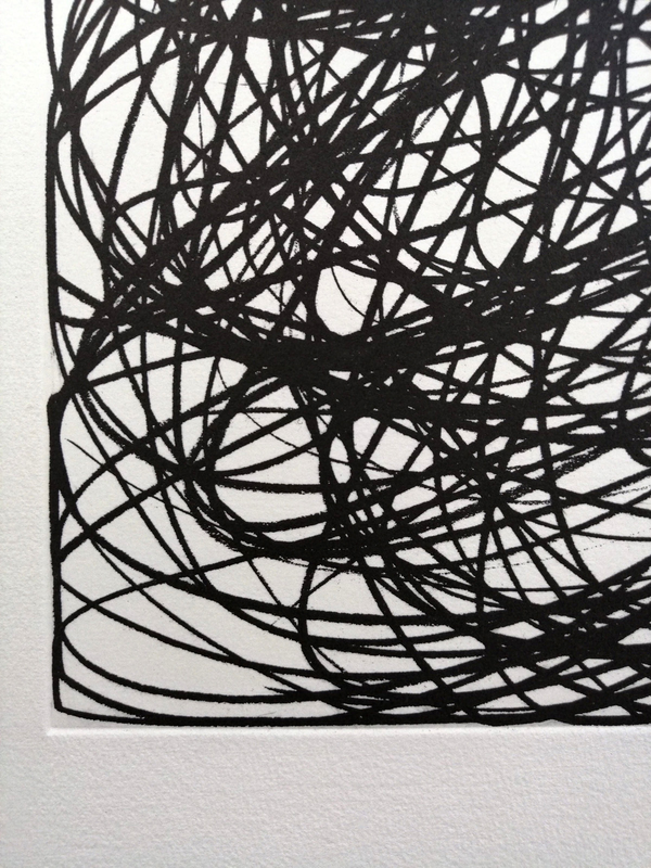La tecnica della Ceramolle permette di ottenere un segno che rispetta la naturalezza del gesto. Di fatto noi registriamo, fissiamo fisicamente, un movimento e una determinata pressione che diventerà la nostra immagine. In questo caso l’artista ha usato alcune matite e il retro del pennello per intervenire su due matrici, una per il nero e l’altra per il colore. Il procedimento à la poupée in fase di inchiostrazione permette di inserire più colori sulla stessa matrice. La stampa in doppia battuta a registro unisce e fonde i due livelli.