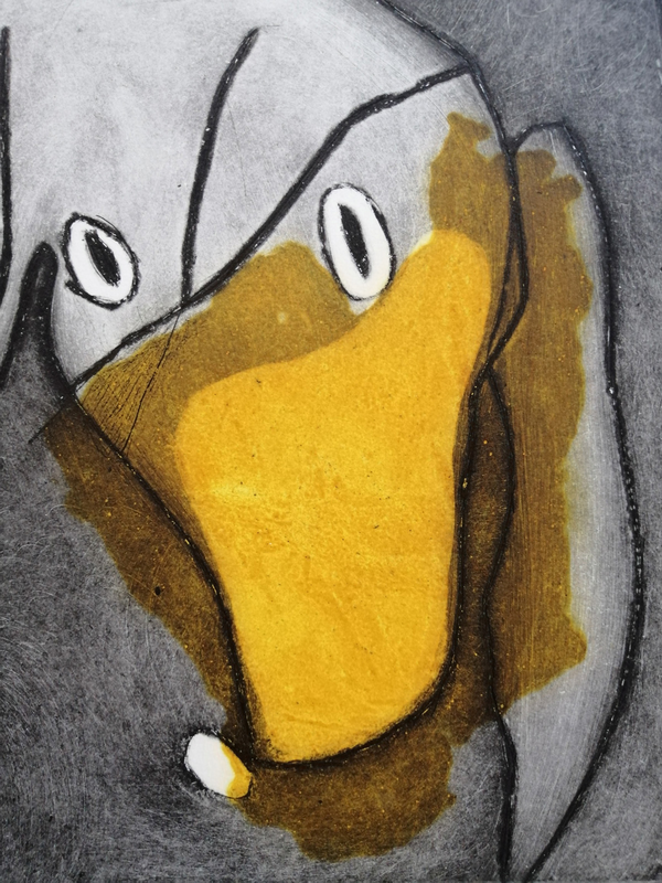 Intervenire direttamente su una matrice significa anche poter fissare su una superficie un movimento velocemente, senza esitazioni o possibilità di ripensamento. L’artista ha deciso di usare un saldatore a elettrodi per ferro direttamente sulla matrice di rame, unendo un supporto nobile della tradizione a strumenti moderni. Gli elettrodi si consumano, depositando gocce e schizzi di ferro che si fondono alla superficie; ma la lentezza della saldatura non riesce ad assecondare la velocità del gesto. Il segno è quindi a singhiozzo, intermittente, su un fondo graffiato e non lucidato, che raccolto grazie a una pulitura a garza crea un tappeto sonoro all’immagine figurativa.