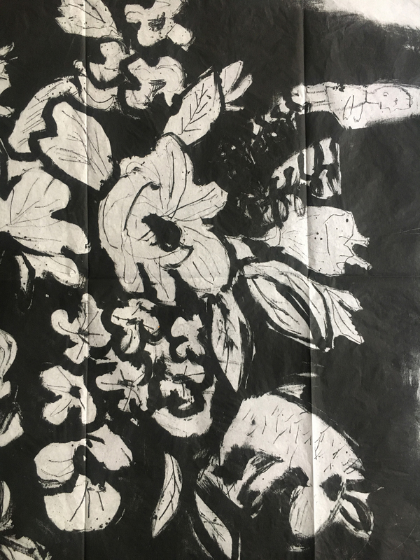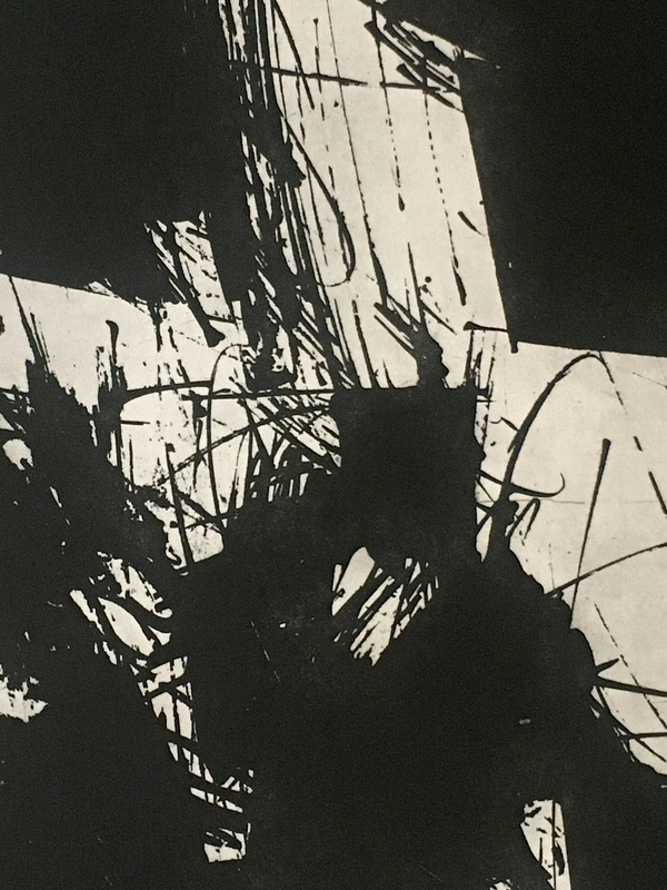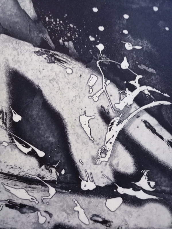 Quando si parla di Monotipia si fa riferimento al concetto di unicità, dal greco "unica impronta". Il Monotipo è il risultato in stampa di una matrice non incisa, ma usata come supporto su cui stendere l’inchiostro, in genere a pennello o a rullo. Il passaggio sotto il torchio riporta su carta, infatti, l’impronta dell’immagine appena dipinta. Con uno strato sottilissimo di inchiostro è possibile rispettare la fedeltà dell’immagine senza incorrere in risultati imprevedibili dati dallo spostamento anomalo dell’inchiostro. Dal dettaglio si capisce come l’artista abbia prima rullato su tutta la superficie con un unico colore e poi dipinto con il nero.