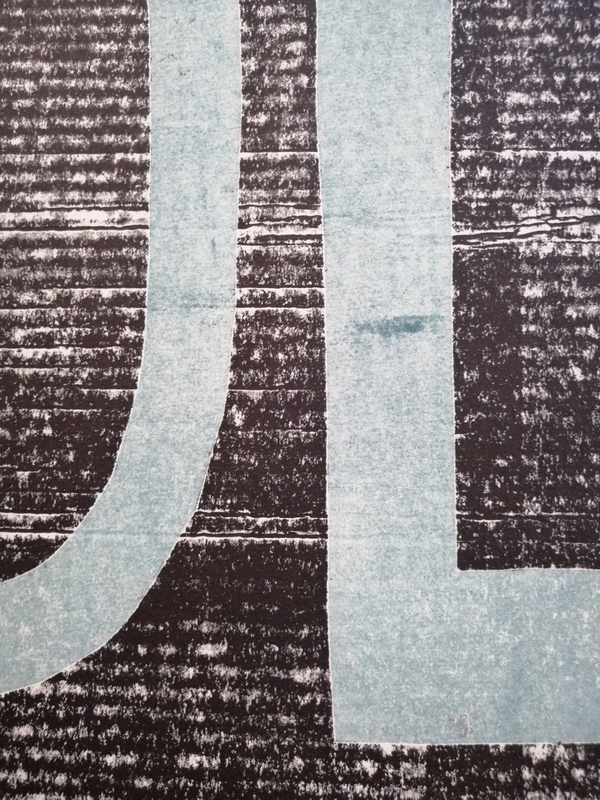 L’alluminio è un metallo duttile, si può incidere direttamente con una punta e ottenere solchi molto profondi con grosse barbe. Il risultato visivo è molto deciso e ha effetto particolarmente tridimensionale. Allo stesso tempo, a differenza di altri metalli, per la sua morbidezza registra qualsiasi lieve graffio, impossibile da eliminare una volta che il materiale è stato intaccato. Nel caso specifico alla pulitura a carta della matrice sono stati aggiunti in fase di stampa alcuni inserti colorati di carte molto sottili in chine-collé.