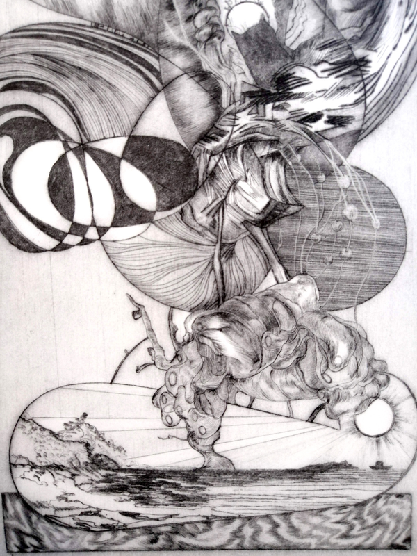 Incidere attraverso la luce. E’ quello che accade utilizzando matrici polimere fotosensibili. Nel caso specifico l’artista ha realizzato su carta un disegno a china con pennino e pennello, lo ha scansionato e riportato su pellicola trasparente. Con un bromografo a luce ultravioletta ha posato la pellicola sulla superficie fotosensibile, ottenendo così il fissaggio di alcune parti del polimero. L’azione della luce ha prodotto dei micro solchi, un risultato del tutto simile all’azione dell’acido. Infine con procedimento in stampa à la poupée ha ottenuto un’immagine con sfumature delicate di diversi colori.