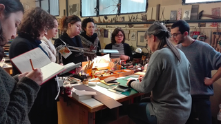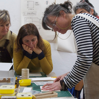 Figura di riferimento nel campo della legatoria in Italia, Cristina Balbiano d'Aramengo, legatrice d'arte, conservatrice e boxmaker, collabora con Daniela Lorenzi da oltre vent’anni.